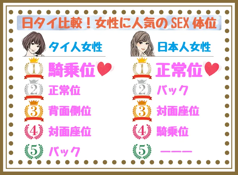 タイ人の女の子と日本人の女の子の好きなセックスの体位ランキング。いかがだったでしょうか。国民性によって好きな体位にも違いがあるようですね。