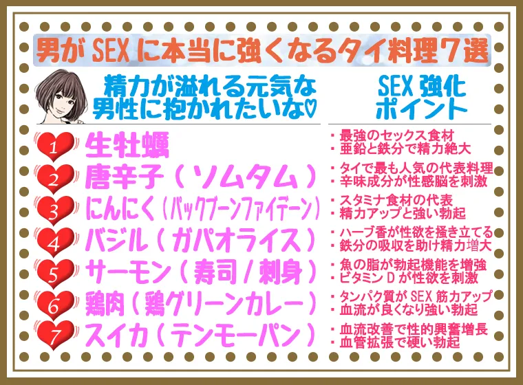 男性がSEXに本当に強くなる人気の定番タイ料理7選、いかがだったでしょうか。